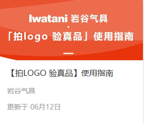 岩谷气具为用户推出【拍LOGO.验真品】产品信息识别系统,使消费者可以随时随地识别产品信息,瞬间验真品。 有效的产品信息识别系统,仅包括品牌官方微信公众号,其他任何方式、网页、工具等均非官网认可渠道,为确保产品识别信息准确,请在官方指定渠道进行识别验证